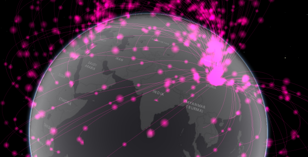 - Fireball uses flying, glowing balls to display a polyline feature layer. For a line feature, an arc is created to connect the start node and the end node of this feature, and a set of balls fly along this arc to represent the value of the field. The higher the value, the larger the ball. The Max Symbol Height and Max Symbol Width options are disabled for this type. After the widget is activated, the balls continuously fly from the start node to the end node.